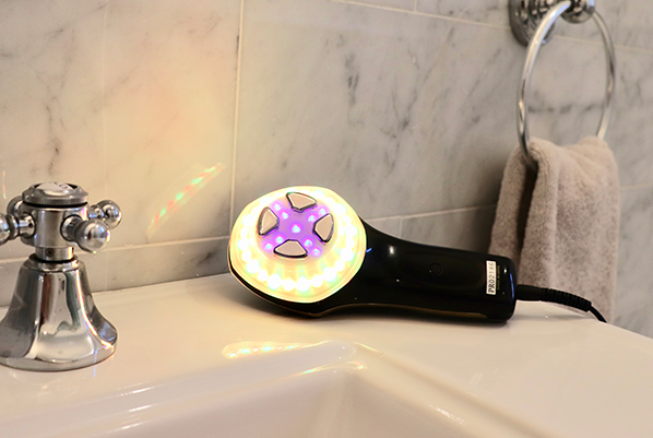 At first glance, the gleaming black and gold chrome handheld pod has more in common with a BMW than a next generation beauty tool. It is solid in the hand with a serious engine, high-powered LED panels, and a gleaming finish like car paint. But a quick flick of the on switch sends its lights flashing. ‘You can feel the micro-current penetrating your skin—if you do just one side, you’ll actually see it lift,” says Gucci, who uses it for ten to twenty minutes at a time before makeup.