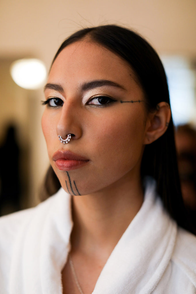 "Quannah is strong, passionate, and gorgeous," says Gucci, who focused on makeup that would enhance her natural beauty. "We kept the complexion very fresh with an emphasis on the eyes." That refined and radiant canvas left the focus on Chasinghorse's traditional Yidįįłtoo tattoos; each distinct marking, along her chin and the corners of her eyes, proudly commemorates a special moment in a Hän Gwich'in woman's life.