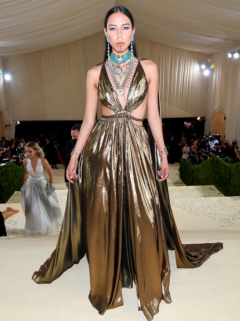 For her Met Gala debut, Chasinghorse chose a gold Dundas x Revolve gown with help from stylist Tabitha Simmons and paired it with authentic Navajo jewelry, flown to New York City by her aunt for the occasion. Picking up on the reflective tones of her metallic gown, Gucci collaborated with Simmons to create a light-catching eye look with shimmering Peau de Soleil highlghts and a mix of Eye Pod shadows.
